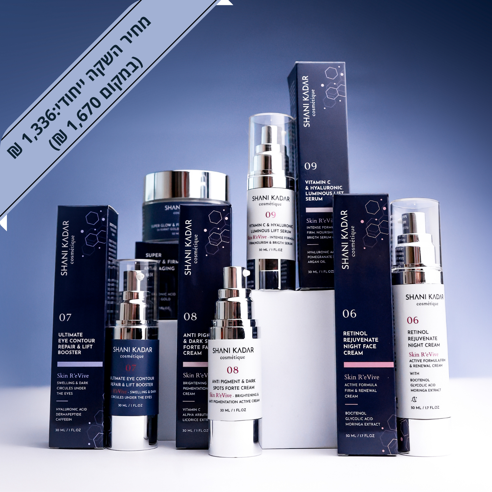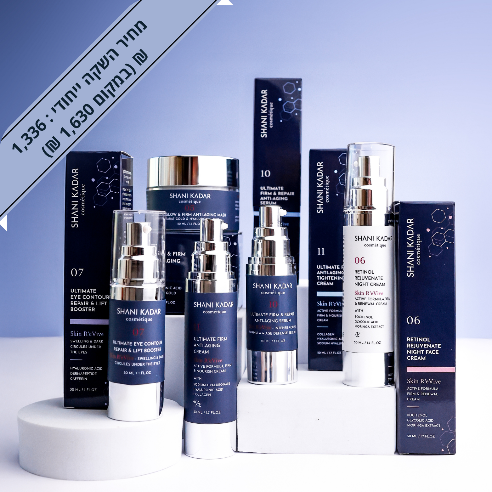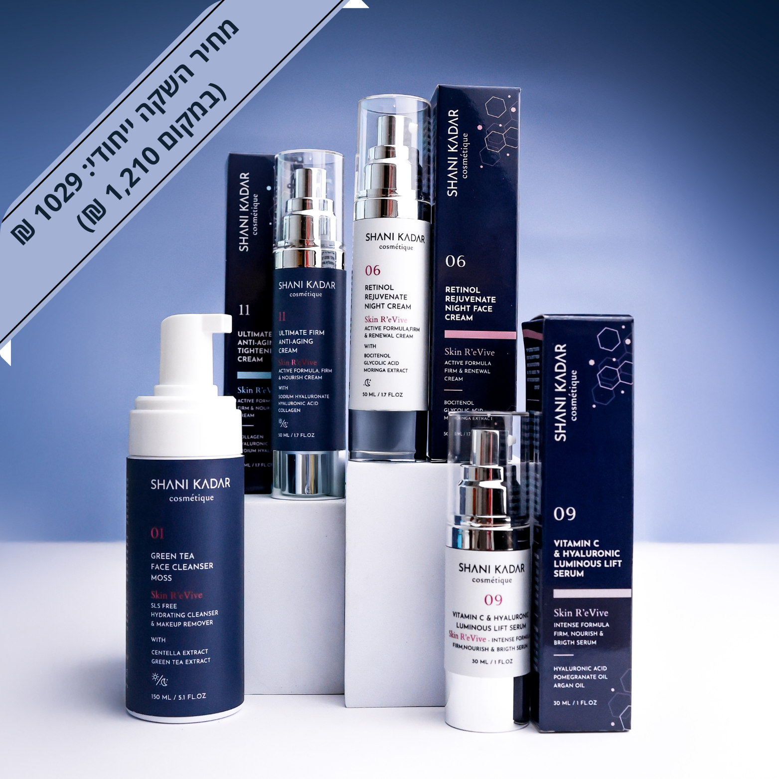 ערכת טיפוח מקיפה ועוצמתית של 5 מוצרים, שפותחה להעניק לעור הפנים מראה מחודש, מוצק וחיוני. מבוססת על שילוב מתקדם של חומצה היאלורונית, קולגן, פפטידים ורטינול, לחידוש עמוק, מיצוק אינטנסיבי וזוהר טבעי עם תוצאות נראות לעין כבר מהשבועות הראשונים.